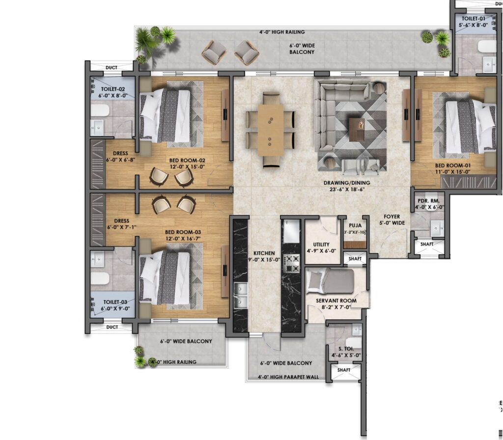 • Variety of Apartments: Choose from high-rise 3, 3+1, and 4+1 BHK luxury apartments, each meticulously designed to cater to the diverse needs and preferences of our esteemed residents.