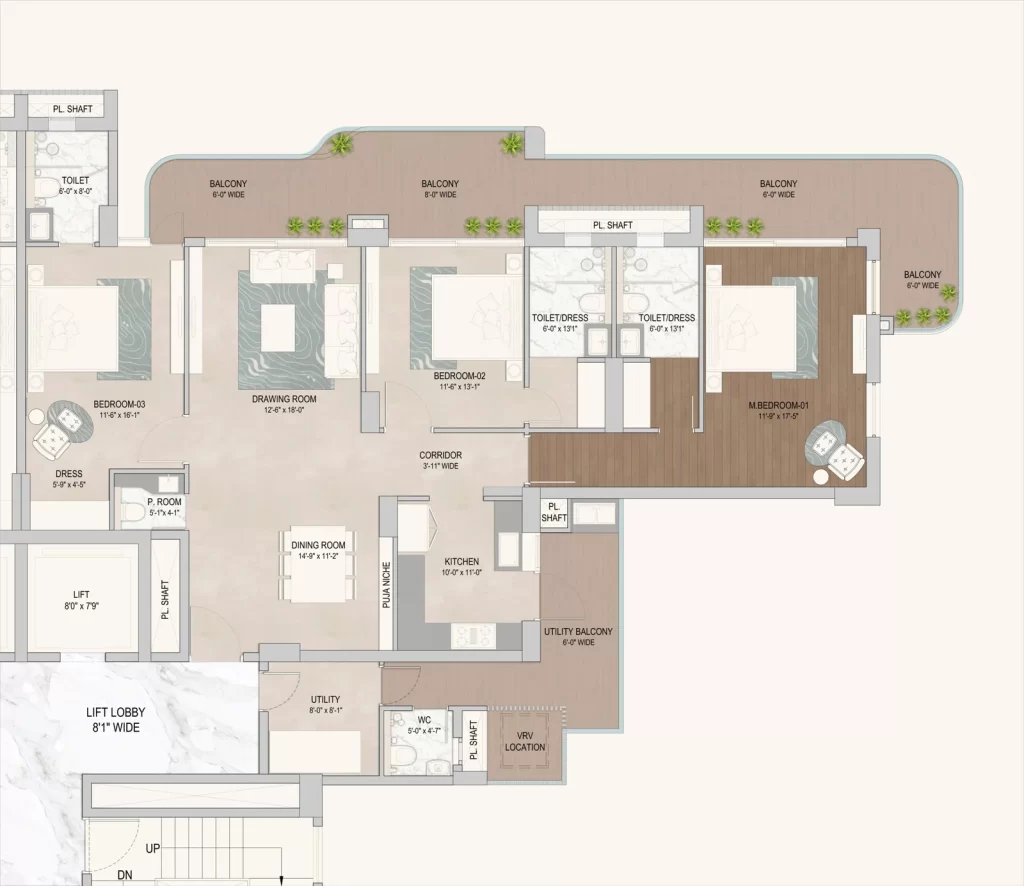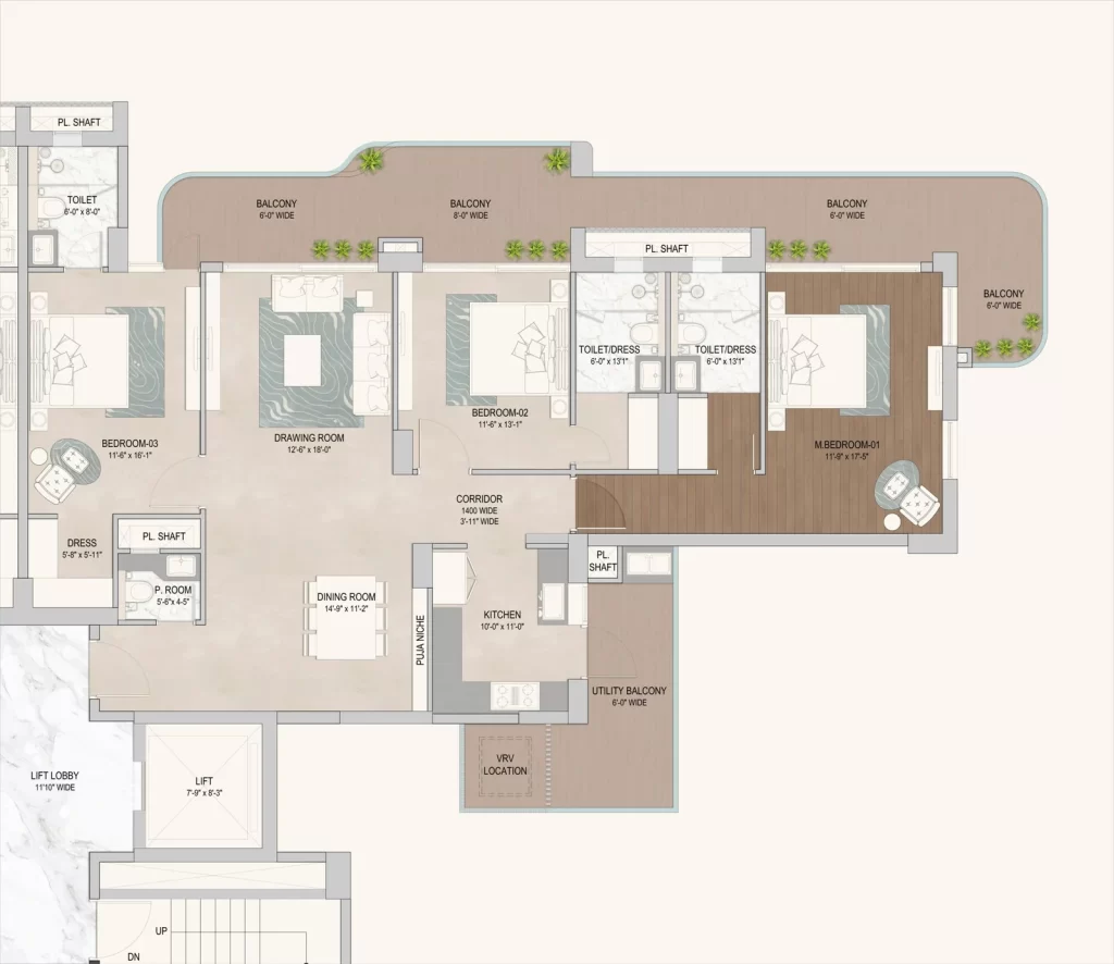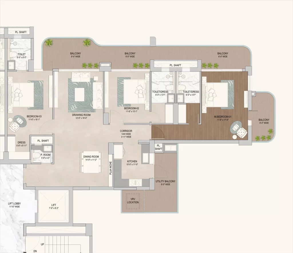 • Spacious Layouts: Offering premium 3 BHK and 4 BHK configurations designed with Vaastu compliance and cross-ventilation.